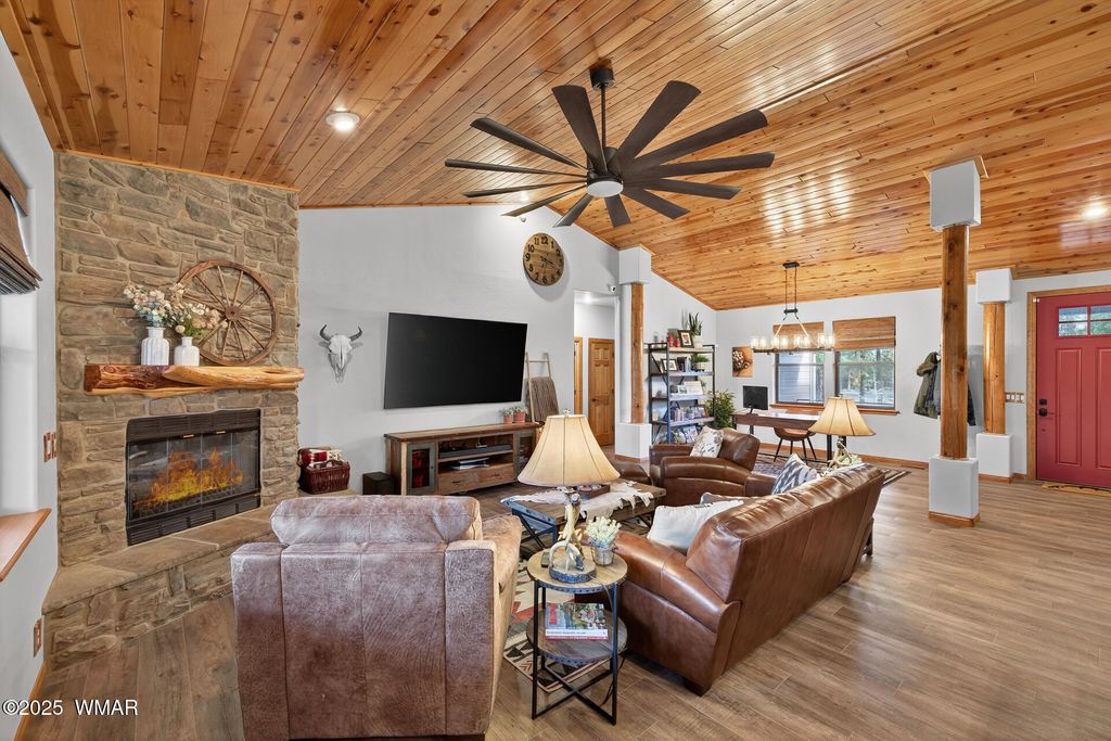 Escape to mountain luxury in this stunning Torreon home, surrounded by towering pines and backing to Hole 16 of the golf course. Featuring 3 bedrooms and 2 baths, this retreat welcomes you with a grand stone fireplace and soaring wood-plank vaulted ceilings. The gourmet kitchen impresses with quartz countertops, beautiful cabinetry, a spacious pantry, and breakfast bar. The primary suite opens to a serene back patio and boasts a spa-like ensuite with dual sinks, soaking tub, tile shower, and walk-in closet. Enjoy the expansive patio stretching the length of the home, perfect for soaking in golf course views and fresh mountain air. Whether you are looking for a permanent residence or a summer getaway this home is a true gem.