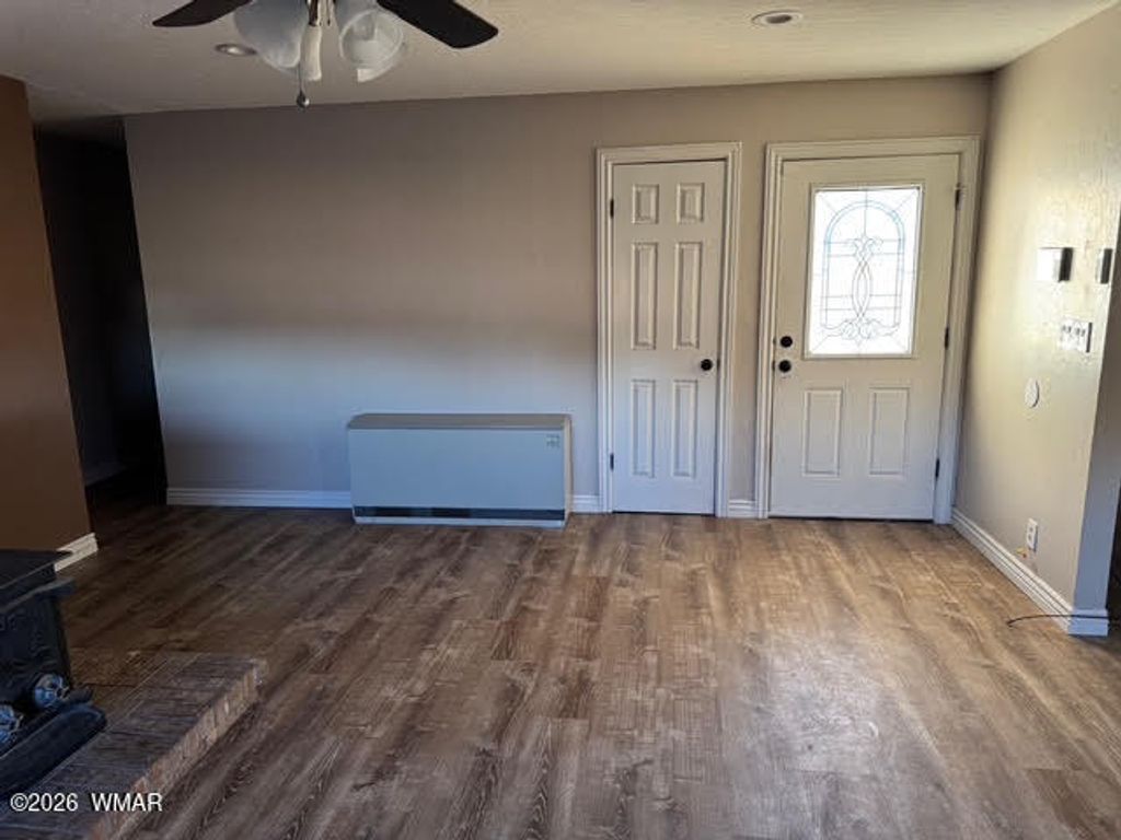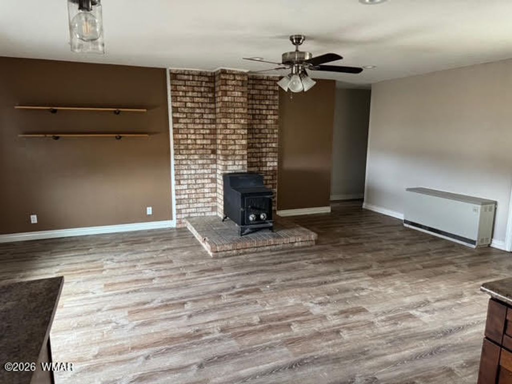Spacious 4-bedroom, 2-bath home with 1824 sq ft situated on approximately 0.72 acres in Eagar. This property offers a comfortable semi-open floor plan connecting the living room, dining area, and kitchen, providing plenty of space for everyday living or entertaining. The kitchen features abundant cabinetry, generous counter space, and a functional layout for cooking and gathering. The home includes a cozy woodstove, dual-pane windows, and a mix of carpet and vinyl flooring. Outside, enjoy a landscaped yard with patio space, and panoramic views of the surrounding countryside. The property allows room for animals and outdoor activities and offers a peaceful rural setting while still being conveniently located within the community. Built in 1981 with a metal roof and wood-frame construction,